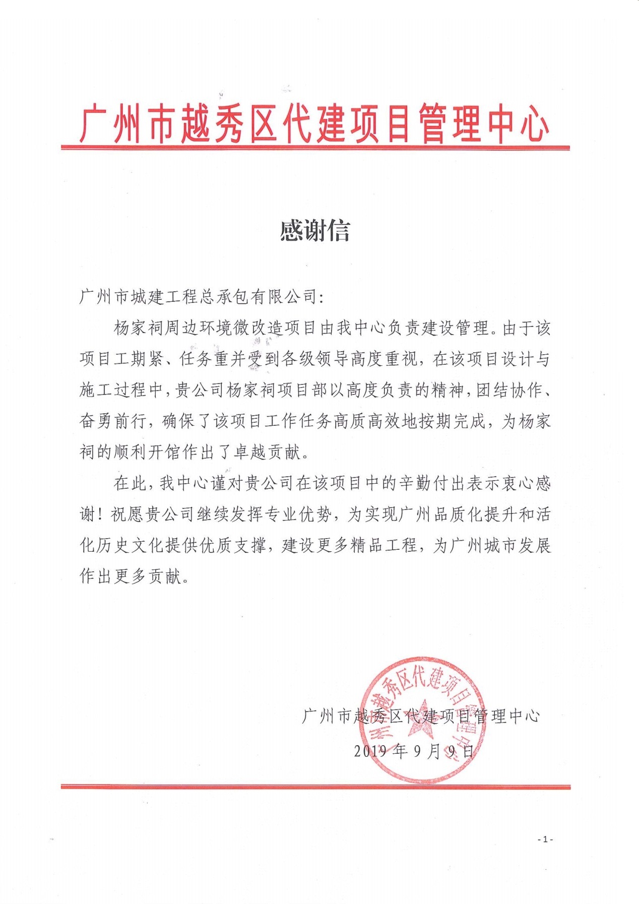 近期,楊家祠周邊環(huán)境微改造項目的建設單位——廣州市越秀區(qū)代建項目管理中心發(fā)來了感謝信,項目屬地居委——北京街道廣衛(wèi)社區(qū)居委會也送來了錦旗,表達了對楊家祠項目部工作的充分肯定和感謝。