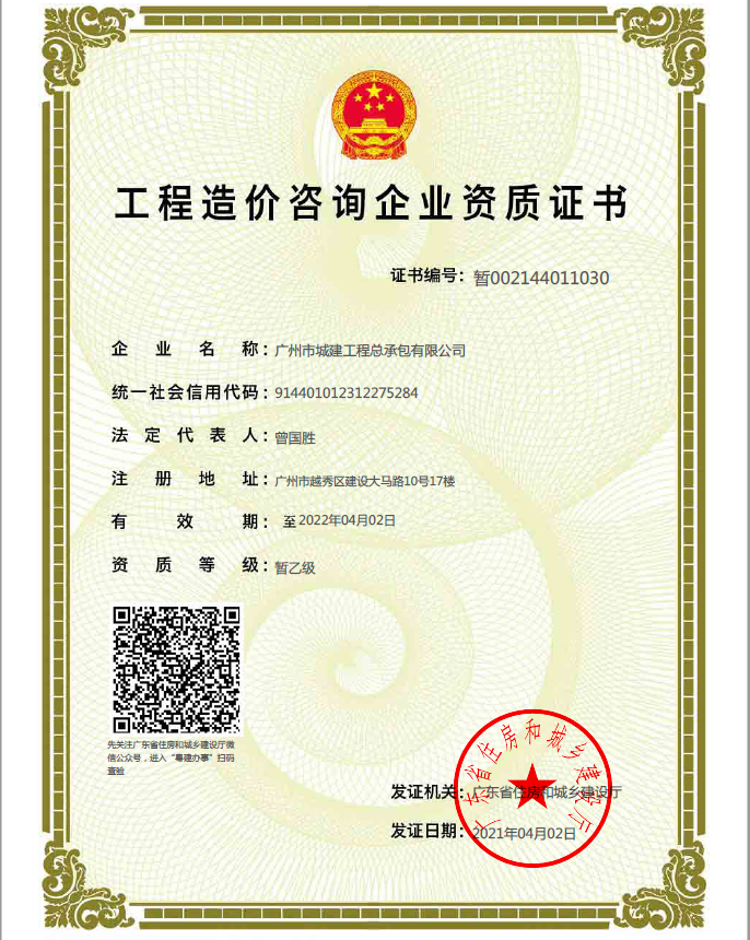 經(jīng)過公司積極籌備,不斷完善材料,公司工程造價(jià)咨詢暫乙級(jí)資質(zhì)申請(qǐng)順利通過廣州市住房和城鄉(xiāng)建設(shè)局審批,并于2021年4月2日取得資質(zhì)證書。此次暫乙級(jí)資質(zhì)的獲得,為公司進(jìn)一步開拓工程造價(jià)咨詢市場(chǎng)奠定了基礎(chǔ),使公司的業(yè)務(wù)范圍得到延伸。公司將更加努力拓寬業(yè)務(wù)渠道,不斷提高工程管理服務(wù)水平,同時(shí)為局和院的概預(yù)算工作提供更全面、更專業(yè)的服務(wù)和保障。