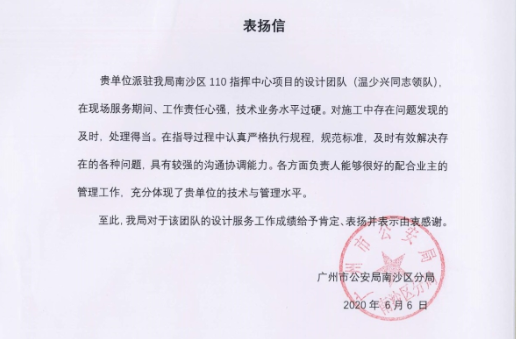 近日,廣州市公安局南沙區(qū)分局送來表揚信,對我公司廣州市南沙公安分局110指揮中心裝修設(shè)計工程的設(shè)計團隊給予表揚。 該項目設(shè)計時間緊、要求高,我公司在承接項目后,派駐專業(yè)設(shè)計團隊全力開展項目設(shè)計任務(wù),積極...